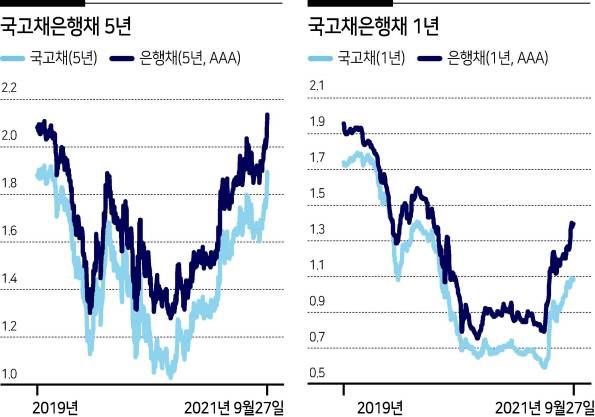 국고채 5년물 금리는 28일 1.9%를 넘어서며 2019년 3월(1.900%) 이후 가장 높은 수준으로 올랐다. 은행채 5년물(AAA, 민평) 금리는 이미 2.126%까지 올라 2018년 12월(2.129%) 이후 최고치다. 1년 만기 국고채도 지난 8월 1년 5개월 만에 1%선을 넘어선 뒤 1.1%선 돌파가 눈앞이다.은행채 1년물은 1.4%에 근접하면서 작년 1월 이후 최고 수준에 이른 상태다. 은행채 5년물은 주택담보대출 금리에 직접 영향을 주고, 은행채 1년물은 신용대출 금리 산정의 기준이 된다.