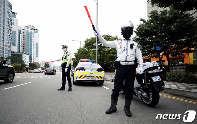 (인천=뉴스1) 정진욱 기자 = 경찰이 28일 인천시 연수구 송도동에서 이륜차 교통법규 위반을 단속하고 있다.인천경찰청은 코로나19로 배달업이 증가하면서 이륜차 법규 위반 및 교통사고가 증가하자 단속활동을 벌이기로 했다. 2021.9.28/뉴스1