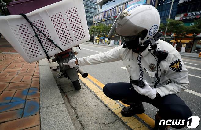 (인천=뉴스1) 정진욱 기자 = 경찰이 28일 인천시 연수구 송도동에서 이륜차 교통법규 위반을 단속하고 있다. 인천경찰청은 코로나19로 배달업이 증가하면서 이륜차 법규 위반 및 교통사고가 증가하자 단속활동을 벌이기로 했다. 2021.9.28/뉴스1