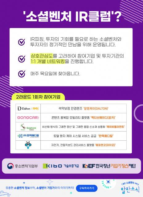 한국청년기업가정신재단은 소셜벤처 육성사업 중 하나로 투자기관과 소셜벤처의 정기적 교류를 위해 2019년부터 소셜벤처 IR클럽을 운영하고 있다.