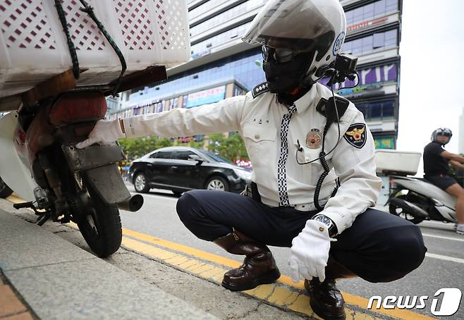 (인천=뉴스1) 정진욱 기자 = 경찰이 28일 인천시 연수구 송도동에서 이륜차 교통법규 위반을 단속하고 있다. 인천경찰청은 코로나19로 배달업이 증가하면서 이륜차 법규 위반 및 교통사고가 증가하자 단속활동을 벌이기로 했다. 2021.9.28/뉴스1