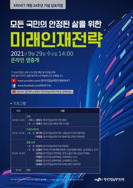 한국직업능력연구원(원장 류장수)은 9월 29일(수) 오후 2시부터 '모든 국민의 안정된 삶을 위한 미래인재전략'을 주제로 'KRIVET 개원 24주년 기념 심포지엄'을 온라인 생중계로 개최한다.