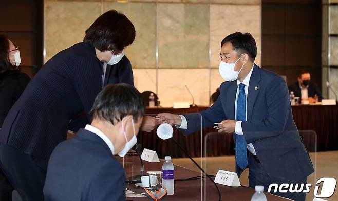 (서울=뉴스1) 박지혜 기자 = 양성일 보건복지부 1차관이 28일 오후 서울 플라자호텔에서 열린 보건복지부 국민연금심의위원회 3차회의에 앞서 위원들과 인사를 나누고 있다. 2021.9.28/뉴스1