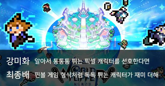 카카오게임즈가 서비스하는 '월드 플리퍼'는 기존의 RPG와 달리 마치 핀볼 게임처럼 캐릭터를 적에게 날려 보내는 독특한 전투 방식을 선보인다. 아기자기한 도트 그래픽과 함께 애니메이션에서 나온듯한 캐릭터의 일러스트를 만나볼 수 있다.