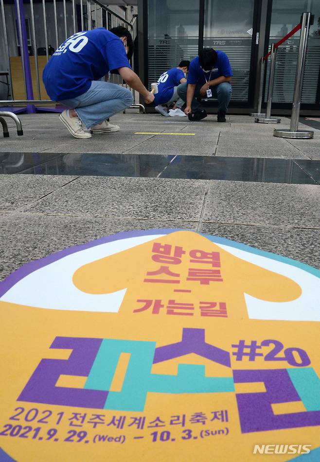 [전주=뉴시스] 김얼 기자 = 2021 전주세계소리축제 개막식을 하루 앞둔 28일 전북 전주시 한국소리문화의전당에서 자원봉사자들이 개막 준비를 하고 있다. 2021.09.28. pmkeul@newsis.com