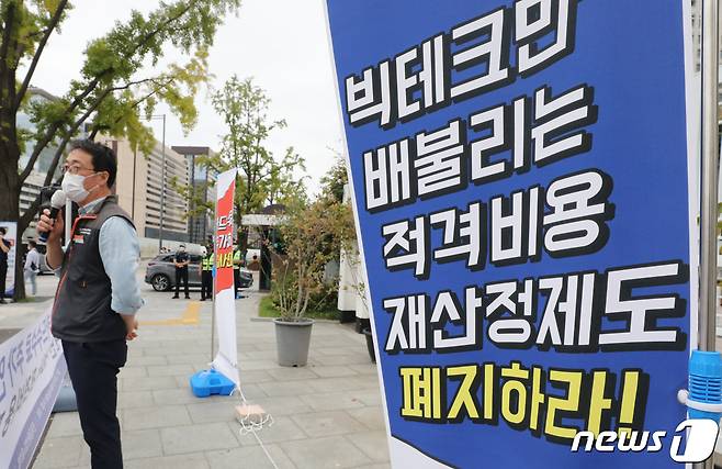 (서울=뉴스1) 송원영 기자 = 민주노총 사무금융연맹 회원들이 28일 오후 서울 종로구 정부서울청사 앞에서 카드수수료 인하 관련 카드사노동조합협의회 입장 발표 기자회견을 하고 있다. 이날 기자회견에서 참석자들은 "카드산업은 고사위기에 처해 있다"며, "카드수수료 추가 인하 반대 및 빅테크만 배불리는 적격비용 재산정 제도 폐지하라"고 촉구 했다. 2021.9.28/뉴스1