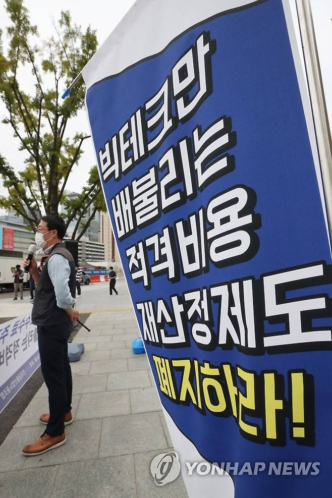 (서울=연합뉴스) 강민지 기자 = 전국금융산업노동조합ㆍ전국사무금융서비스노동조합ㆍ카드사노동조합협의회가 28일 오후 정부서울청사 앞에서 카드수수료인하 관련 적격비용 재산정 제도 폐지 촉구 공동 기자회견을 하고 있다.