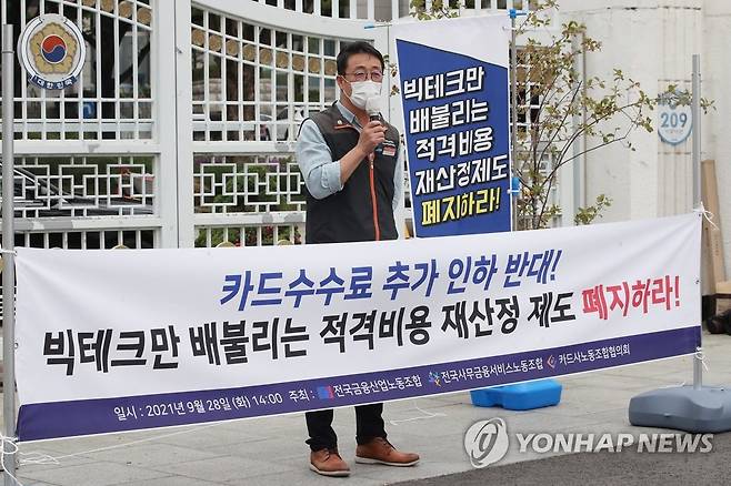 (서울=연합뉴스) 강민지 기자 = 전국금융산업노동조합ㆍ전국사무금융서비스노동조합ㆍ카드사노동조합협의회 주최로 28일 오후 정부서울청사 앞에서 카드수수료인하 관련 적격비용 재산정 제도 폐지 촉구 공동 기자회견이 열리고 있다.
