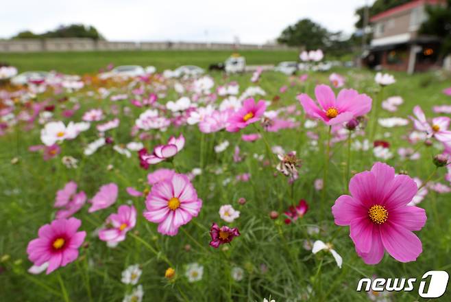 (수원=뉴스1) 김영운 기자 = 선선한 가을 날씨를 보인 28일 오후 경기도 수원시 팔달구 행궁동에 코스모스가 활짝 피어있다. 2021.9.28/뉴스1
