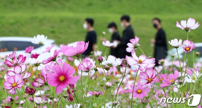 (수원=뉴스1) 김영운 기자 = 선선한 가을 날씨를 보인 28일 오후 경기도 수원시 팔달구 행궁동에 핀 코스모스 사이로 시민들이 길을 걷고 있다. 2021.9.28/뉴스1