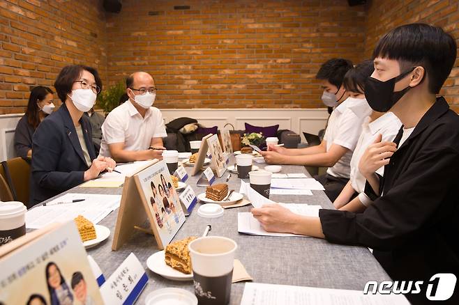 (서울=뉴스1) = 임혜숙 과학기술정보통신부 장관이 28일 오후 서울 영등포구 여의도 하우스(How's)카페에서 열린 '청년 과학자 간담회'에서 청년 과학자들의 고민과 아이디어를 듣고 있다. (과학기술정보통신부 제공) 2021.9.28/뉴스1