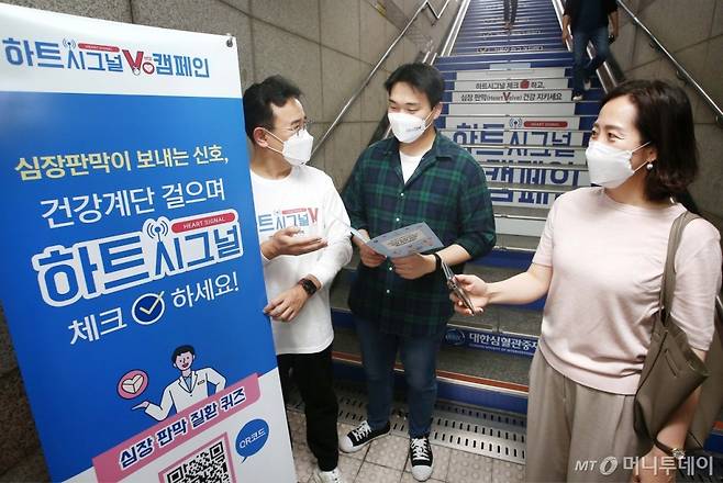 세계 심장의 날을 하루 앞둔 28일 서울 광화문역에서 대한심혈관중재학회가 '하트 시그널 V 캠페인 건강계단' 행사를 진행하고 있다.