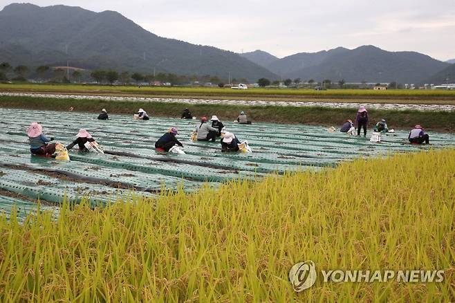 (강진=연합뉴스) 조남수 기자 = 28일 전남 강진군 작천면 황금빛 들녘에서 농가 일손들이 추수를 마친 논에 이모작으로 마늘을 심고 있다. 2021.9.28