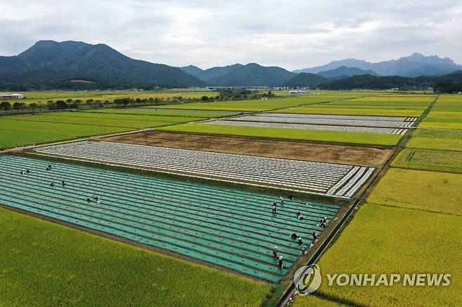 (강진=연합뉴스) 조남수 기자 = 28일 전남 강진군 작천면 황금빛 들녘에서 농가 일손들이 추수를 마친 논에 이모작으로 마늘을 심고 있다. 2021.9.28