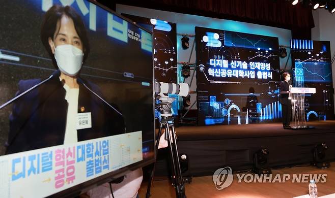 (서울=연합뉴스) 유은혜 사회부총리 겸 교육부 장관이 28일 충남 천안시 단국대 천안캠퍼스에서 열린 '디지털 신기술 인재양성 혁신공유대학 출범식'에 참석해 축사하고 있다. 2021.9.28