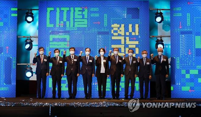 (서울=연합뉴스) 유은혜 사회부총리 겸 교육부 장관(가운데)이 28일 충남 천안시 단국대 천안캠퍼스에서 열린 '디지털 신기술 인재양성 혁신공유대학 출범식'에서 참석자들과 기념촬영을 하고 있다. 2021.9.28