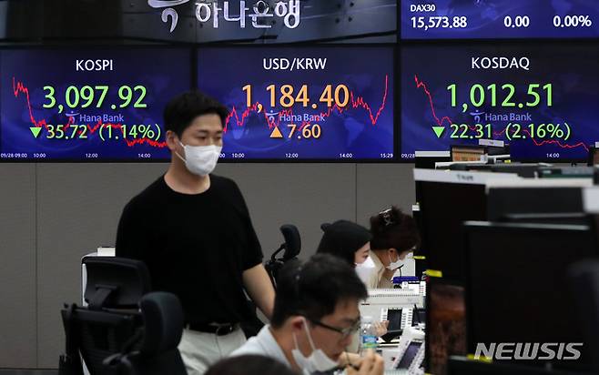 [서울=뉴시스] 추상철 기자 = 코스피와 코스닥은 동반 하락을 원달러환율은 상승 마감한 28일 오후 서울 중구 하나은행 딜링룸 전광판에는 코스피지수가 전 거래일에 비해 35.72포인트(1.14%) 하락한 3097.92를 코스닥 지수는 22.31포인트(2.16%) 하락한 1012.51을 원달러환율은 7.6원 오른 1184.4원을 나타내고 있다. 2021.09.28. scchoo@newsis.com
