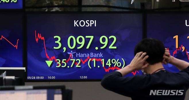 [서울=뉴시스] 추상철 기자 = 코스피가 3100선 아래로 하락 마감한 28일 오후 서울 중구 하나은행 딜링룸 전광판에는 코스피지수가 전 거래일에 비해 35.72포인트(1.14%) 하락한 3097.92를 나타내고 있다. 2021.09.28. scchoo@newsis.com