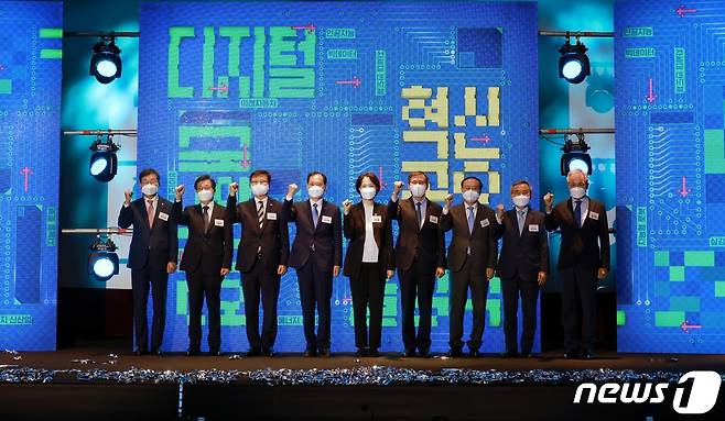 (서울=뉴스1) = 28일 오후 충남 천안시 단국대학교 천안캠퍼스에서 열린 '디지털 신기술 인재양성 혁신공유대학' 출범식에서 유은혜 사회부총리 겸 교육부장관 등 참석자들이 파이팅을 외치고 있다.