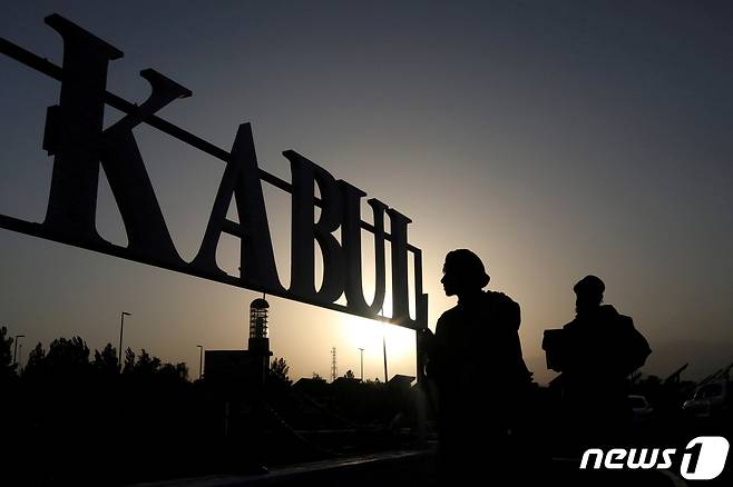 (카불 로이터=뉴스1) 금준혁 기자 = 9일(현지시간) 탈레반 군인들이 카불공항 표지판 앞에 서 있다.