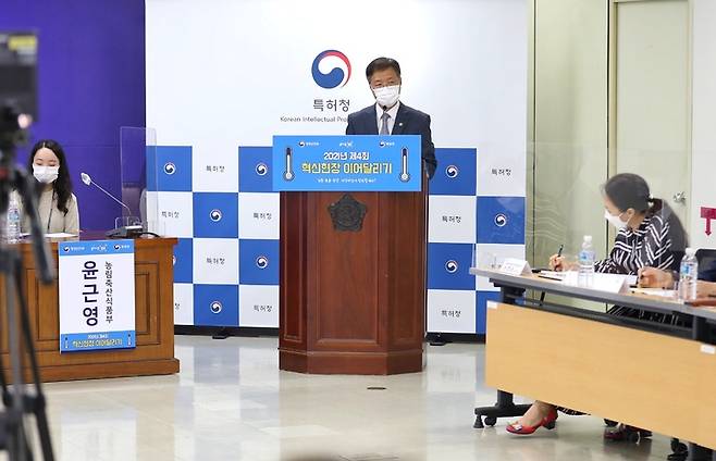 [대전=뉴시스] 김양수 기자 = 28일 특허청이 행정안전부와 정부대전청사서 특허청의 주요 혁신성과를 공유하고 조직문화를 진단하는 '제4회 혁신현장 이어달리기' 행사를 개최한 가운데 김용래 특허청장이 인사말을 하고 있다.(사진=특허청 제공).2021.09.28.