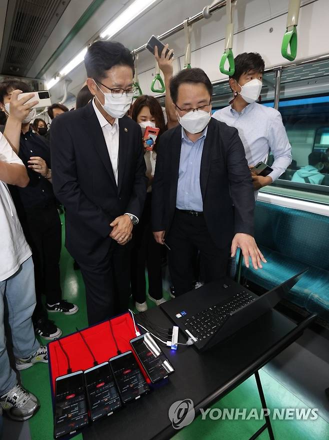 (서울=연합뉴스) 서명곤 기자 = 28일 오후 서울 성동구 지하철2호선 신답역에서 열린 28㎓ 5G 지하철 와이파이 성능개선 실증 착수회에서 조경식 과학기술정보통신부 2차관을 비롯한 참석자들이 2호선에 탑승해 신답역과 성수역 사이를 왕복하며 통신 성능을 점검하고 있다.