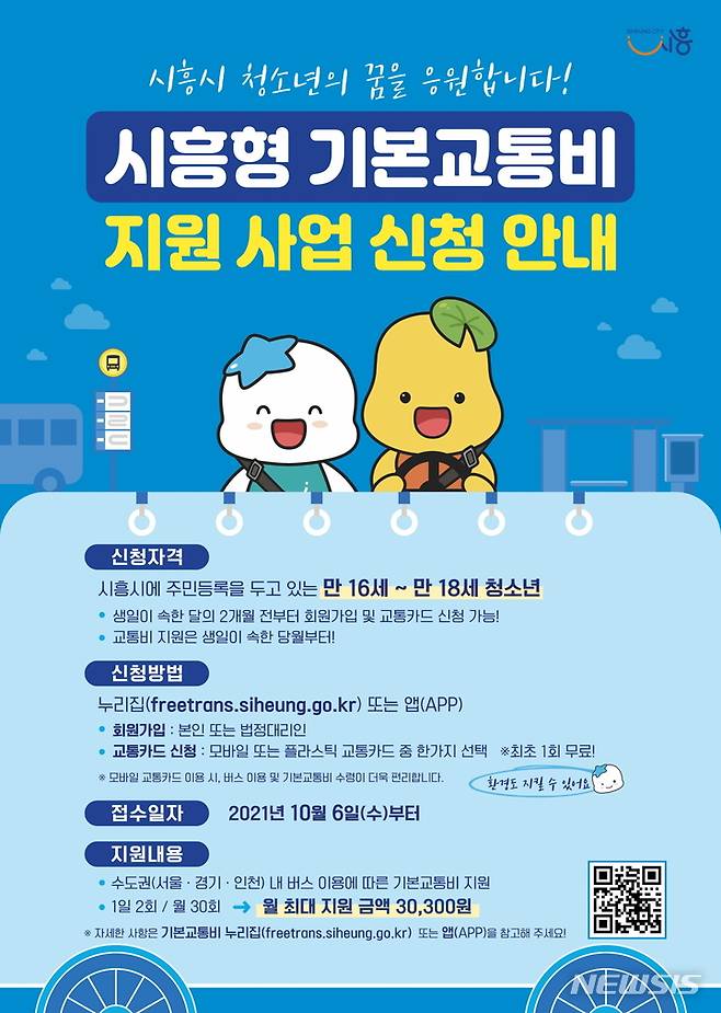 경기 시흥시는 10월6일부터 관내 만 16~18세 청소년을 대상으로 '시흥형 기본교통비' 지원에 따른 신청을 받는다.