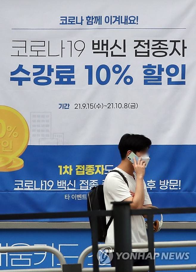 (서울=연합뉴스) 임헌정 기자 = 28일 서울 서대문구의 한 학원에 코로나19 백신 접종자 수강료 할인 안내 현수막이 걸려 있다. 2021.9.28