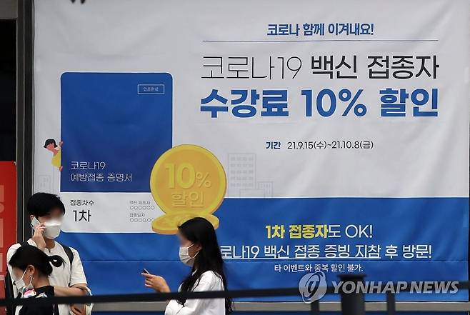 (서울=연합뉴스) 임헌정 기자 = 28일 서울 서대문구의 한 학원에 코로나19 백신 접종자 수강료 할인 안내 현수막이 걸려 있다. 2021.9.28