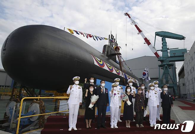 (울산=뉴스1) 윤일지 기자 = 28일 오후 울산 동구 현대중공업에서 3000톤급 잠수함인 '장보고-Ⅲ 배치(Batch)-I' 3번함 '신채호함' 진수식이 열린 가운데 부석종 해군참모총장, 한영석 현대중공업 사장, 전용규 방위사업청 한국형잠수함사업단장 등 참석자들이 기념촬영을 하고 있다. 이 잠수함은 일제강점기 민족의식 고취에 앞장선 사학자이자 독립운동가인 신채호 선생(1880년~1936년)을 기려 '신채호함'으로 명명했다. 신채호함에는 지난 15일 잠수함 발사에 성공한 잠수함발사탄도미사일(SLBM)이 탑재된다. 2021.9.28/뉴스1
