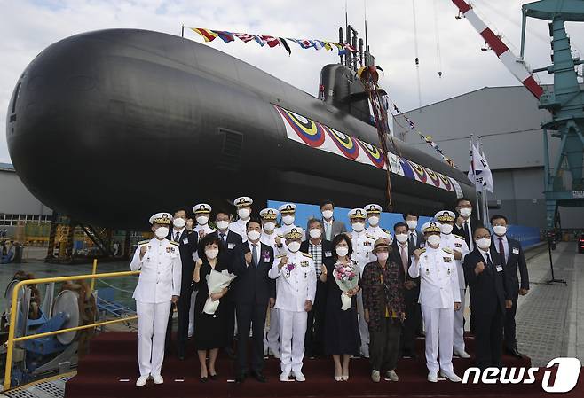 (울산=뉴스1) 윤일지 기자 = 28일 오후 울산 동구 현대중공업에서 3000톤급 잠수함인 '장보고-Ⅲ 배치(Batch)-I' 3번함 '신채호함' 진수식이 열린 가운데 부석종 해군참모총장, 한영석 현대중공업 사장, 전용규 방위사업청 한국형잠수함사업단장 등 참석자들이 기념촬영을 하고 있다. 이 잠수함은 일제강점기 민족의식 고취에 앞장선 사학자이자 독립운동가인 신채호 선생(1880년~1936년)을 기려 '신채호함'으로 명명했다. 신채호함에는 지난 15일 잠수함 발사에 성공한 잠수함발사탄도미사일(SLBM)이 탑재된다. 2021.9.28/뉴스1