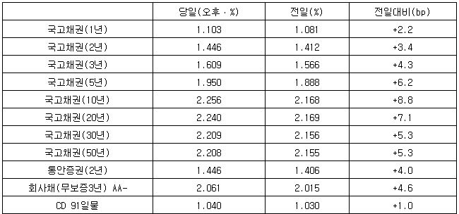 10년물 금리는 연 2.256%로 8.8bp 상승했다. 5년물과 2년물은 각각 6.2bp 상승, 3.4bp 상승으로 연 1.950%, 연 1.446%에 마감했다.