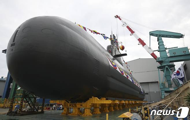 (울산=뉴스1) 윤일지 기자 = 28일 오후 울산 동구 현대중공업에서 3000톤급 잠수함인 '장보고-Ⅲ 배치(Batch)-I' 3번함 '신채호함' 진수식이 열리고 있다. 이 잠수함은 일제강점기 민족의식 고취에 앞장선 사학자이자 독립운동가인 신채호 선생(1880년~1936년)을 기려 '신채호함'으로 명명했다. 신채호함에는 지난 15일 잠수함 발사에 성공한 잠수함발사탄도미사일(SLBM)이 탑재된다. 2021.9.28/뉴스1
