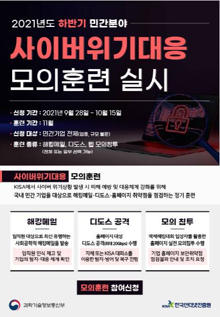 참여를 원하는 기업은 소재·규모에 상관없이 이날부터 10월 15일까지 신청할 수 있으며, 훈련은 11월 중 기업별로 불시·실전으로 진행된다.