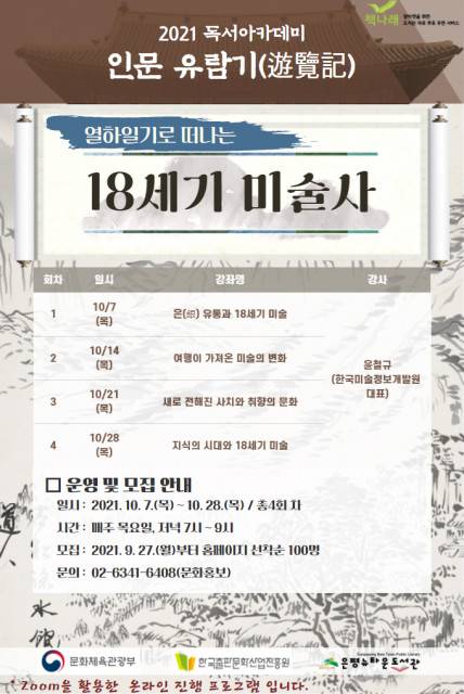 구립은평뉴타운도서관(관장 박종범)이 10월 7일부터 28일까지 집 콕 랜선 미술 여행 ‘열하일기로 떠나는 18세기 미술사’ 특강을 개최한다고 28일 밝혔다.