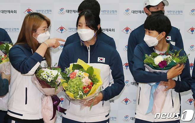 (인천공항=뉴스1) 임세영 기자 = 대한민국 여자 양궁 대표팀 강채영, 장민희, 안산(왼쪽부터)이 28일 오후 인천국제공항을 통해 귀국 후 기자회견에 앞서 꽃다발을 받고 있다. 한국 양궁은 미국 사우스다코타주 양크턴에서 열린 세계선수권대회에서 남녀 단체전(김우진-오진혁-김제덕/장민희-안산-강채영)과 혼성전(김우진-안산), 남녀 개인전(김우진, 장민희)에서 금메달을 따내며 12년 만에 세계선수권대회 전종목 석권이라는 위업을 달성했다. 2021.9.28/뉴스1
