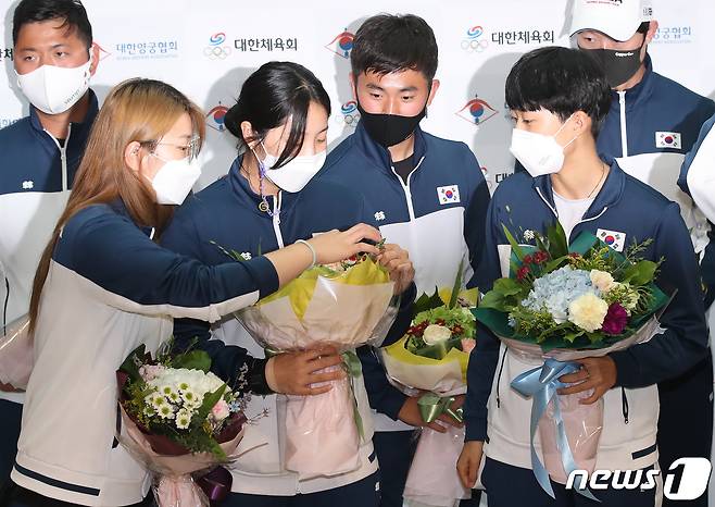 (인천공항=뉴스1) 임세영 기자 = 대한민국 양궁 대표팀 강채영, 장민희, 김제덕, 안산(왼쪽부터)이 28일 오후 인천국제공항을 통해 귀국 후 기자회견에 앞서 꽃다발을 받고 있다. 한국 양궁은 미국 사우스다코타주 양크턴에서 열린 세계선수권대회에서 남녀 단체전(김우진-오진혁-김제덕/장민희-안산-강채영)과 혼성전(김우진-안산), 남녀 개인전(김우진, 장민희)에서 금메달을 따내며 12년 만에 세계선수권대회 전종목 석권이라는 위업을 달성했다. 2021.9.28/뉴스1