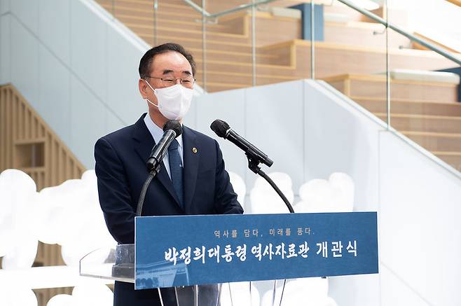 [구미=뉴시스] 박홍식 기자 = 장세용 경북 구미시장이 28일 박정희대통령역사자료관 개관식에서 기념사를 하고 있다. (사진=구미시 제공) 2021.09.28 photo@newsis.com