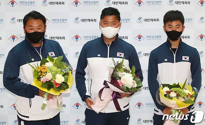 대한민국 남자 양궁 대표팀 오진혁, 김우진, 김제덕 선수(왼쪽부터)가 28일 오후 인천국제공항을 통해 귀국 후 꽃다발을 받고 있다.