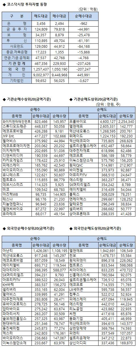[표]코스닥 기관/외국인 매매동향(9/28 3시30분)