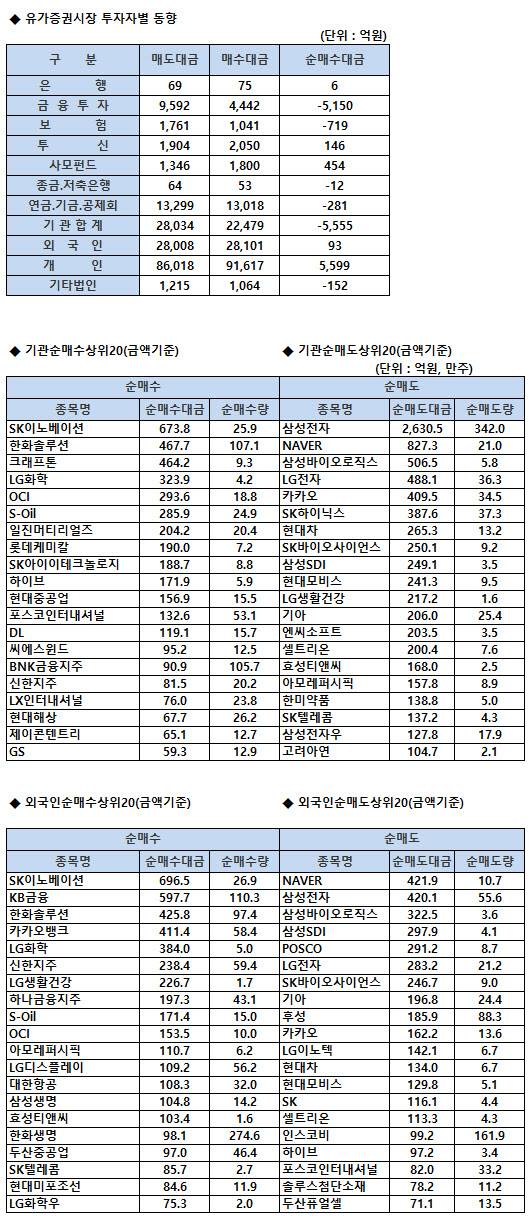 [표]코스피 기관/외국인 매매동향(9/28 3시30분)