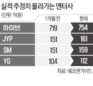 엔터 4사의 3분기 실적도 좋다. 하이브의 3분기 영업이익 컨센서스는 754억원으로, 역대 최고 실적을 낼 것으로 전망된다. 지난 7월 발매된 BTS의 싱글앨범 ‘버터’가 1주일 만에 판매량 197만 장을 돌파하는 등 기록적인 판매액을 올린 덕분이다. YG 역시 블랙핑크 멤버 리사의 솔로 앨범이 약 95만 장 팔리면서 3분기 실적이 컨센서스(105억원)를 크게 웃돌 것으로 예상된다.