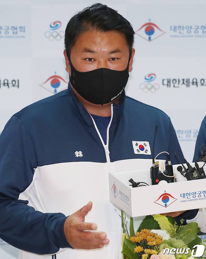 (인천공항=뉴스1) 임세영 기자 = 대한민국 남자 양궁 대표팀 오진혁이 28일 오후 인천국제공항을 통해 귀국 후 취재진의 질문에 답하고 있다. 한국 양궁은 미국 사우스다코타주 양크턴에서 열린 세계선수권대회에서 남녀 단체전(김우진-오진혁-김제덕/장민희-안산-강채영)과 혼성전(김우진-안산), 남녀 개인전(김우진, 장민희)에서 금메달을 따내며 12년 만에 세계선수권대회 전종목 석권이라는 위업을 달성했다. 2021.9.28/뉴스1