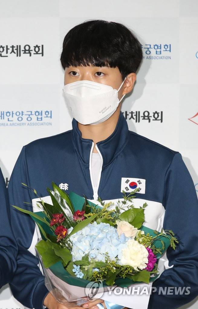 (영종도=연합뉴스) 박동주 기자 = 12년 만에 세계선수권대회 전 종목 석권의 위업을 이룬 한국 리커브 양궁의 여자 대표팀 안산이 28일 오후 인천국제공항을 통해 귀국해 인터뷰하며 꽃을 들고 있다. 2021.9.28