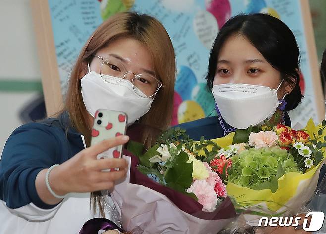 (인천공항=뉴스1) 임세영 기자 = 대한민국 여자 양궁 대표팀 강채영, 장민희가 28일 오후 인천국제공항을 통해 귀국 후 셀카를 찍고 있다. 한국 양궁은 미국 사우스다코타주 양크턴에서 열린 세계선수권대회에서 남녀 단체전(김우진-오진혁-김제덕/장민희-안산-강채영)과 혼성전(김우진-안산), 남녀 개인전(김우진, 장민희)에서 금메달을 따내며 12년 만에 세계선수권대회 전종목 석권이라는 위업을 달성했다. 2021.9.28/뉴스1
