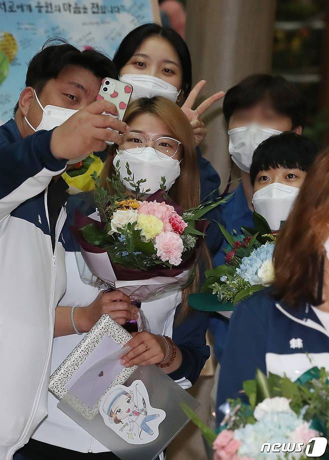 (인천공항=뉴스1) 임세영 기자 = 대한민국 여자 양궁 대표팀 강채영, 장민희, 안산이 28일 오후 인천국제공항을 통해 귀국 후 기자회견에 앞서 사진을 찍고 있다. 한국 양궁은 미국 사우스다코타주 양크턴에서 열린 세계선수권대회에서 남녀 단체전(김우진-오진혁-김제덕/장민희-안산-강채영)과 혼성전(김우진-안산), 남녀 개인전(김우진, 장민희)에서 금메달을 따내며 12년 만에 세계선수권대회 전종목 석권이라는 위업을 달성했다. 2021.9.28/뉴스1