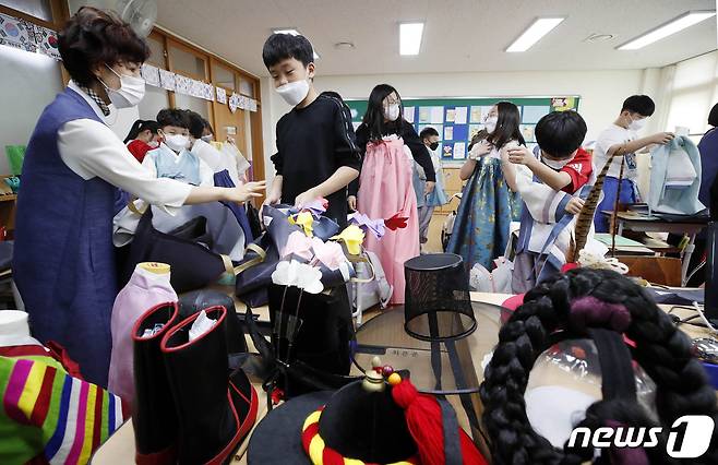 (광주=뉴스1) 허단비 기자 = 28일 광주 북구 신용초등학교에서 열린 찾아가는 한복체험교실에 학생들이 올바른 한복 착용법을 배우고 있다.(광주북구 제공)2021.9.28/뉴스1