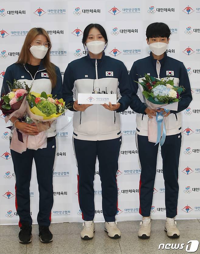 대한민국 여자 양궁 대표팀 강채영, 장민희, 안산 선수(왼쪽부터)가 28일 오후 인천국제공항을 통해 귀국 후 취재진의 질문에 답하고 있다.