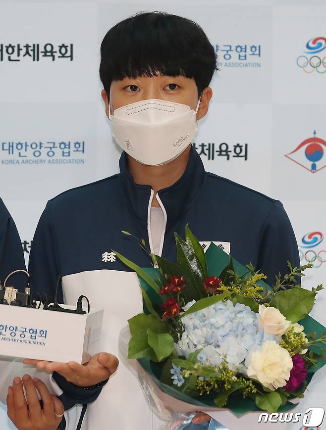 대한민국 여자 양궁 대표팀 안산이 28일 오후 인천국제공항을 통해 귀국 후 취재진의 질문에 답하고 있다.