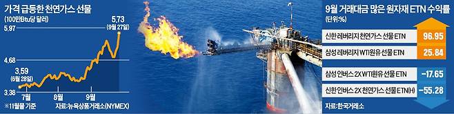 천연가스·원유 레버리지 ETN 상품 수익률도 급등했다. 28일 천연가스 선물 가격 지수를 추종하는 ETN은 하루에만 약 14%, 지수를 두 배로 추종하는 상품들은 약 30%씩 수익률을 냈다. 이달 들어 거래량이 많은 ETN 상위권은 대부분 원자재 ETN이 차지했다. ‘신한 레버리지 천연가스 선물 ETN’, ‘삼성 레버리지 천연가스 선물 ETN B’는 이달 들어서만 약 97% 올랐다. 원유 가격도 꾸준히 오르면서 ‘삼성 레버리지 WTI 원유 선물 ETN’도 같은 기간 약 26% 올랐다. 반면 천연가스, 원유 가격 하락에 베팅한 ‘신한 인버스 2X 천연가스 선물 ETN(H)은 55%, ‘삼성 인버스 2X WTI원유 선물 ETN’은 18% 손실을 냈다.